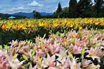 日本有数のユリ産地ほりのうち。畑一面に白、ビンク、黄色、オレンジのユリが咲き乱れます。